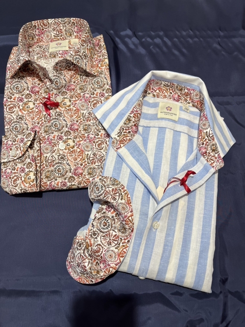 太めのブルーのストライプがさわやかさを際立たせ、ちらっと見える襟裏の花柄とカフスがプライベートな時に楽しめます!